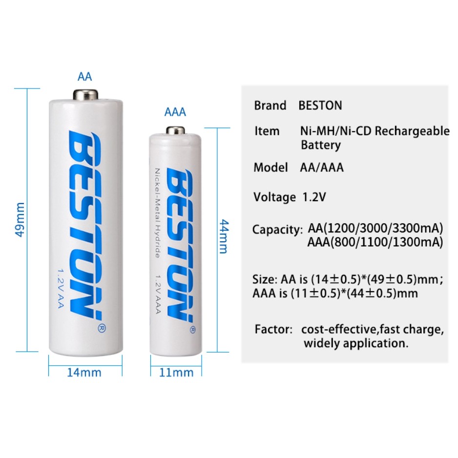 Pin sạc BESTON AA có sẵn các dung lượng 1200mAh 2000mAh, 3000mAh, 3300mAh cho khách hàng có nhiều lựa chọn.: