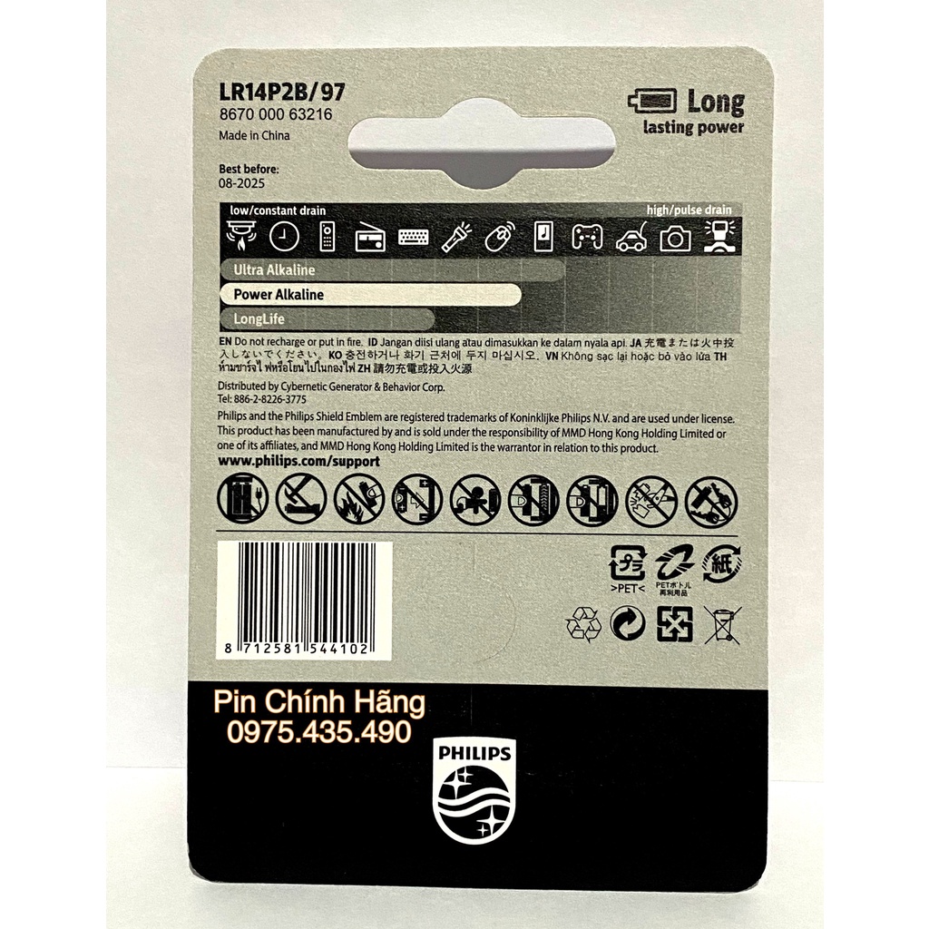 Pin Trung Philips Alkaline (Size C) Dung Lượng Cao 1.5V Hàng Chính Hãng Vỉ 2 Viên