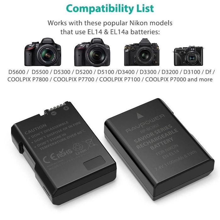 📸 Thích hợp với mẫu máy Nikon phổ biến này sử dụng pin EN-EL14: Nikon D3100, D3200, D3300, D3400, D5100, D5200, D5300, D5500, D5600 Coolpix P7000, P7100, P7200, P7700, P7800, P8000 và Nikon DF📸 Đặc điểm nổi bật của Bộ sạc pin máy ảnh EN-EL14 chính hãng Ravpower