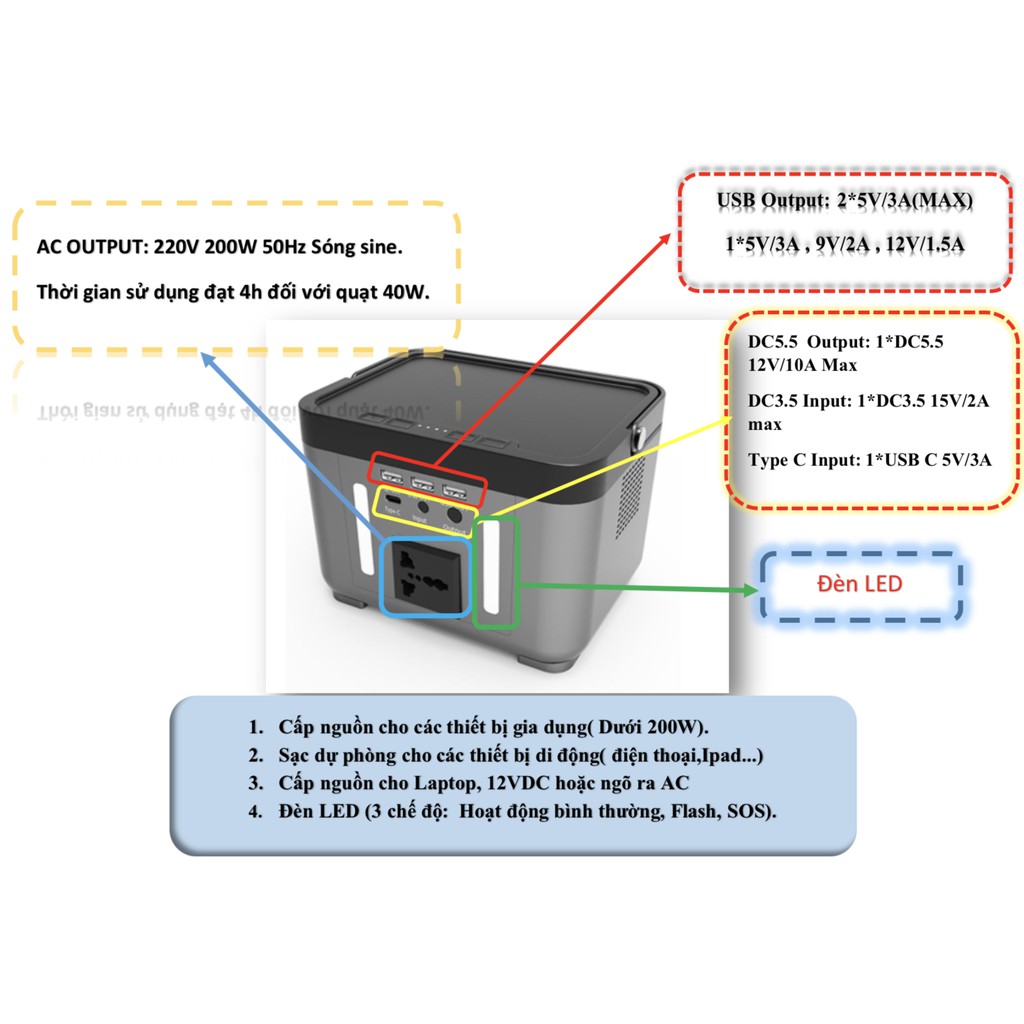 1. Ngõ ra ổ cắm AC 220V:Sử dụng tủ lạnh mini 40W 3-4 giờ, Sử dụng đèn LED 26 giờ 12V/5W,