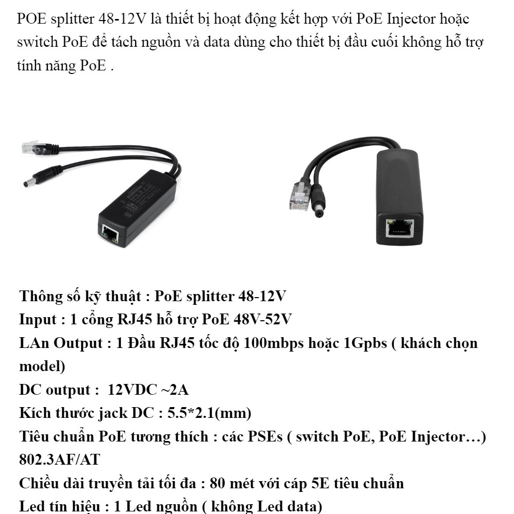 Ứng dụng : dùng cho các thiết bị đầu cuối không hỗ trợ PoE ( camera , router wifi , switch…) yêu cầu nguồn điệp áp hoạt động 5V hoặc 12VDC ( <24W)