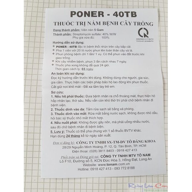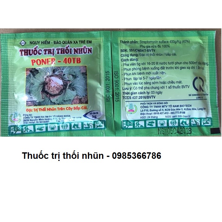 Thuốc poner-40tb là dạng viên sủi bọt khi bỏ vào nước hòa tan, chuyên đặt trị thối nhũn trên bắp cải và cũng ứng dụng được cho các lại cây bị thối nhũn khác như hoa lan, cây cảnh, rau cải v.v..Anh chị trồng hoa lan hoặc rau cải lâu ngày sẽ gặp phải tình trạng thối nhũn do mùa mưa hoặc do vườn quá ẩm sẽ thường bị thối nhũn cây, thối lá, thối củ v.v… nay có Poner-40tb có chứa hạt chất Streptomycin 40% + phụ gia giúp nhà vườn trị được thối nhũn và ngăn ngừa thối cây, lá cây, hoa lan, củ tăng năng xuất cây trồng thu hoạch cao. Anh chị nhà vườn, chơi hoa, trồng cây cảnh, rau cải yên tâm khi bị tình trạng thối nhũn thì hãy phun xịt poner-40tb sẽ thấy hiệu quả ngay để phòng trị thối nhũn. (nhớ + thêm 2ml benkona sát trùng cho mỗi lít nước nhé)