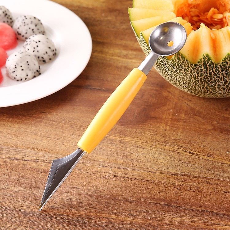 • Dụng cụ cắt tỉa trái cây được thiết kế gồm 2 đầu, một đầu dùng để múc hoa quả, một đầu để tỉa rau củ, trái cây, cho bạn gái thể hiện sự khéo léo và cắt tỉa nhiều dĩa trái cây bắt mắt cho cả gia đình.• Kích thước: Đầu tròn 2,4cm, dầu dẹt 2cm