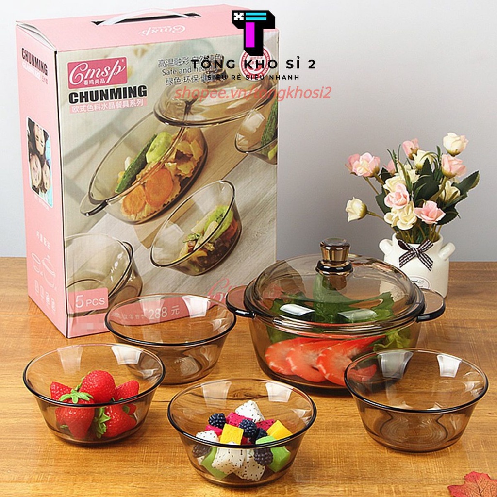 Nhà cửa & Đời sống > Bộ đồ bàn ăn > Tô || PVN32738 Combo bộ 5 món 1 nồi & 4 bát thuỷ tinh chịu nhiệt T2Còn hàng