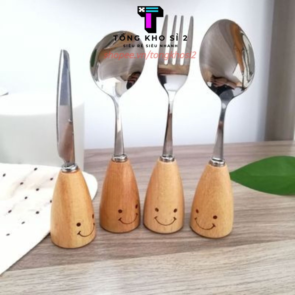 Nhà cửa & Đời sống > Bộ đồ bàn ăn > Dĩa || PVN34582 Set 4 chi tiết thìa dĩa dao cán gỗ mặt cười T2Còn hàng