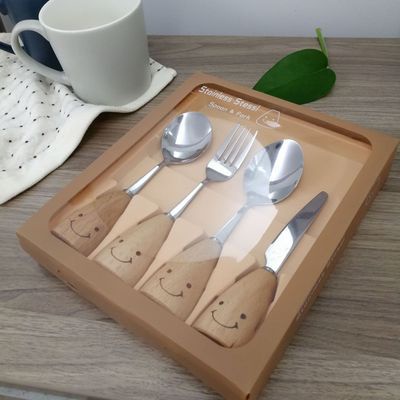 Nhà cửa & Đời sống > Bộ đồ bàn ăn > Dĩa || PVN34582 Set 4 chi tiết thìa dĩa dao cán gỗ mặt cười T2 .Còn hàng