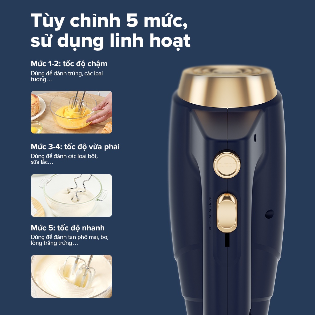 + Sản phẩm có 5 mức tùy chỉnh linh hoạt: Mức 1-2 là tốc độ chậm, phù hợp để đánh trứng, các loại tương,...; Mức 3-4 ở mức vừa phải, dùng đánh các loại bột, sữa lắc,...; Mức 5 là tốc độ nhanh nhất, bạn có thể đánh tan phô mai, bơ và bông lòng trắng trứng,...
