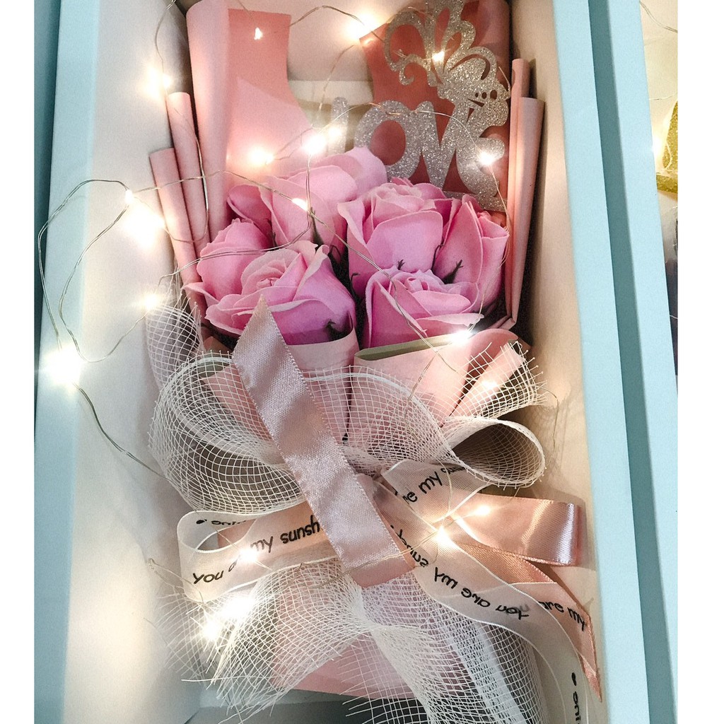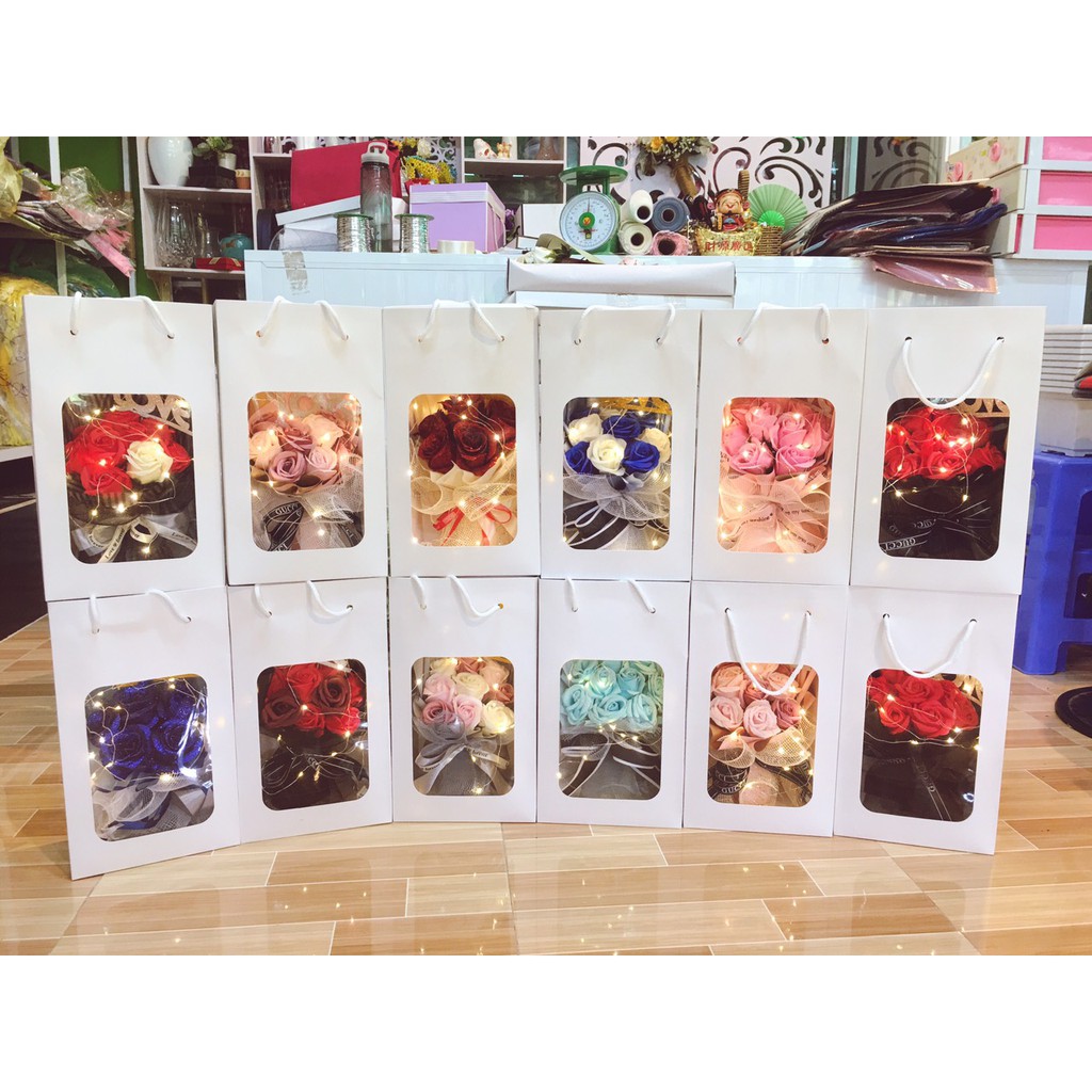 Hộp 9 hoa hồng sáp thơm có đèn chớp tag chữ LOVE cao cấp Ánh Sao ( tặng kèm túi xách và thiệp màu trắng thời trang)Sản phẩm gồm: 1 hộp hoa hồng sáp 9 bông hoa hồng sáp ( tặng kèm thiệp và túi xách trắng)