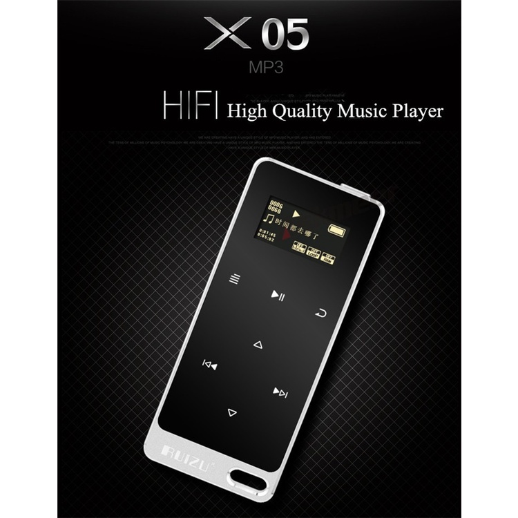 Ruizu X05 thiết kế kiểu dáng nhỏ gọn nhưng đầy chắc chắn, vỏ ngoài được làm hoàn toàn bằng hợp kim nguyên khối, kích thước tương đương với thẻ ATM 87 x 38 x 7mm, trọng lượng 45g. Màn hình tương tác cảm ứng Oled kích thước màn hình 1.1 inches. Các nút điều chỉnh cảm ứng đơn giản hóa cho người dùng.Máy nghe nhạc Ruizu X05 hỗ trợ nhiều định dạng