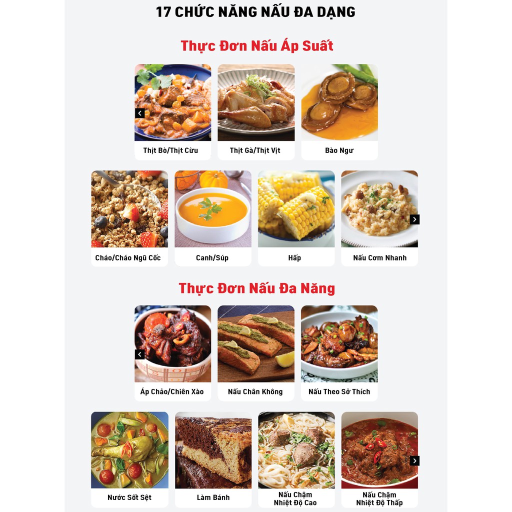 Chức năng chính: Chiên thực phẩm, Giữ ấm, Hấp, Làm bánh, Nấu bào ngư, Nấu bò, Nấu cháo, Nấu chân không, Nấu chậm nhiệt độ cao, Nấu chậm nhiệt độ thấp, Nấu cơm, Nấu gà / vịt, Nấu soup, Nấu sốt, Nấu theo sở thích.