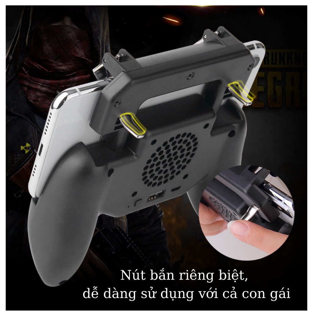 TTay cầm chơi game có nút bấm hỗ trợ chơi 4 ngón kèm tản nhiệt điện thoại dành cho PUBG, ROS, Free Fire- Thích hợp với các điện thoại có màn hình từ 4.7-6.7 inch ( điều chỉnh được)