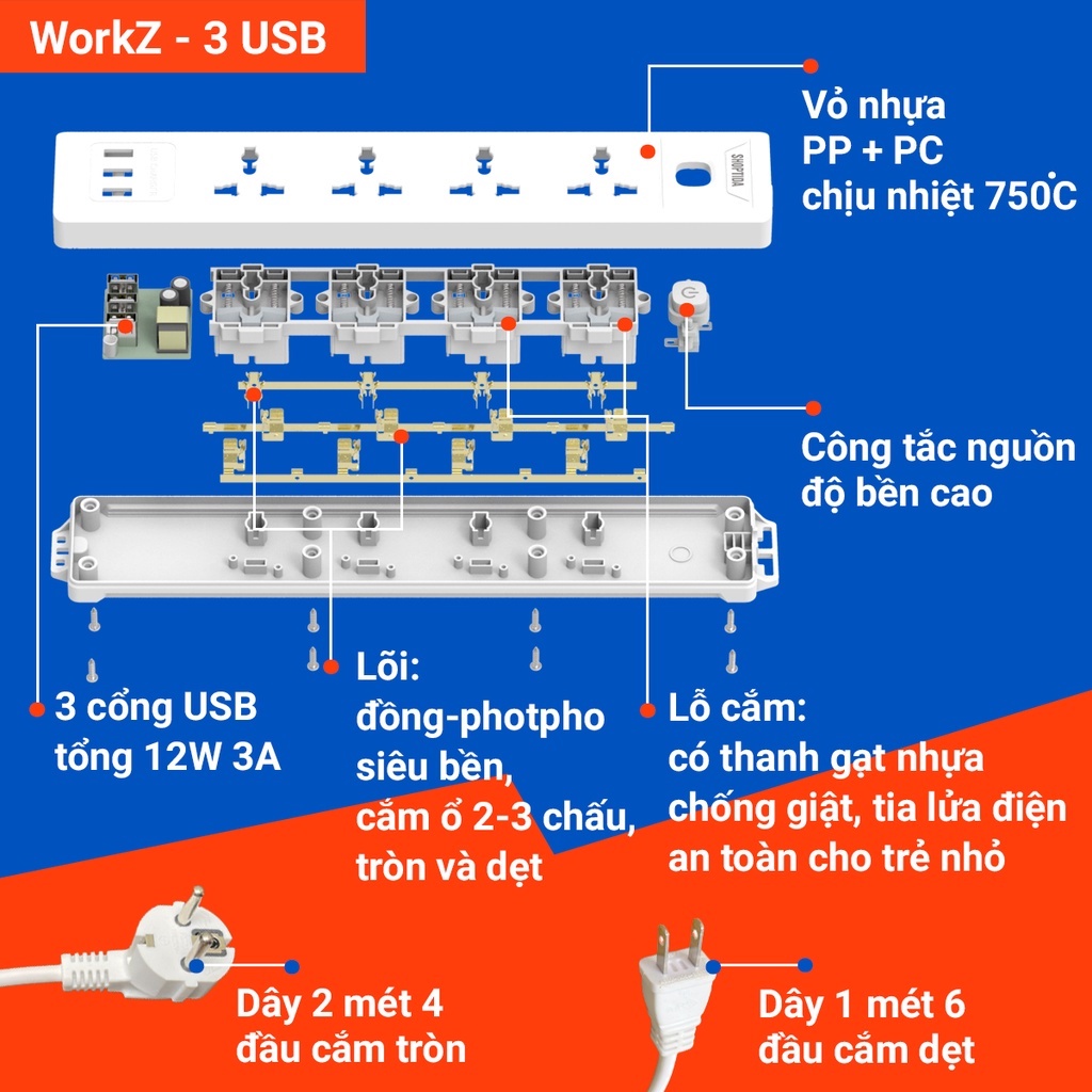 - Ổ 3 chạc lõi đồng đàn hồi tốt, cắm chắc chắn tới 5.000 lần