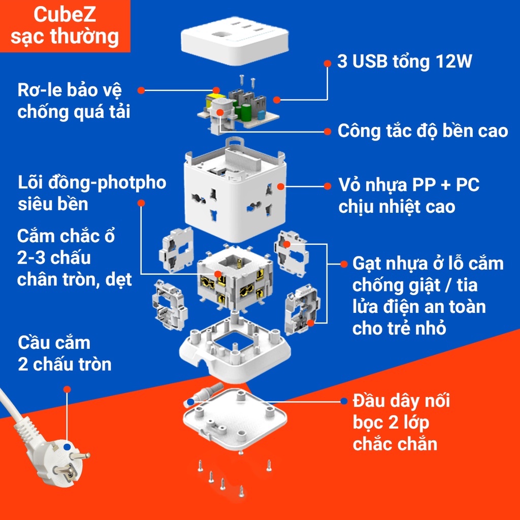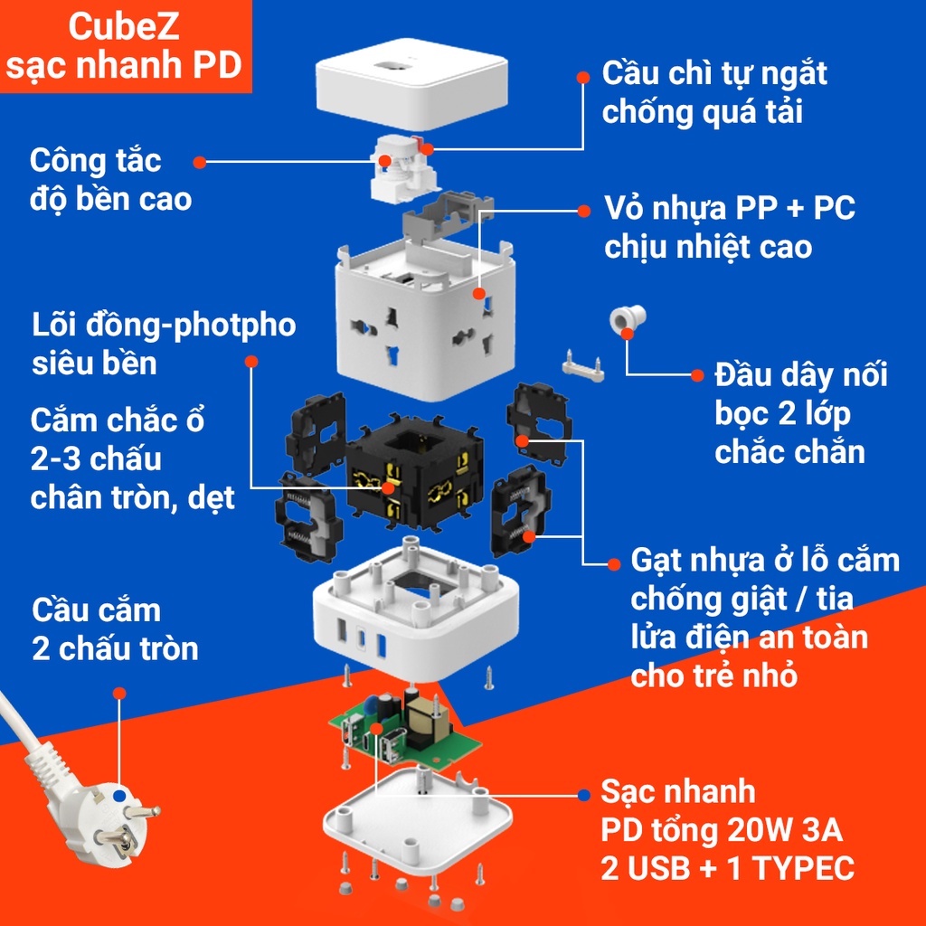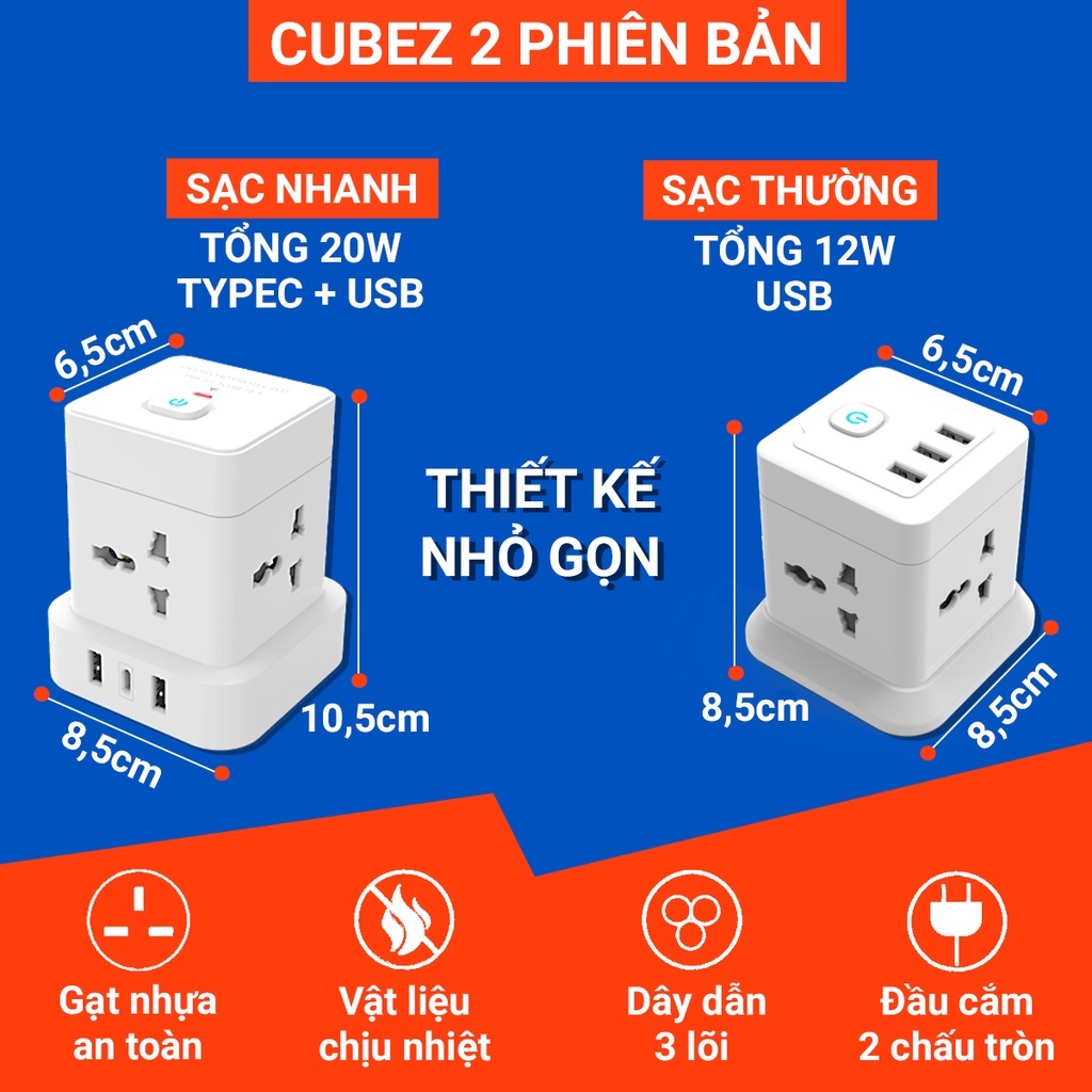 - Ổ điện vuông bản sạc nhanh: CubeZ sạc nhanh PD20W kích thước 11x11x15 (cm)