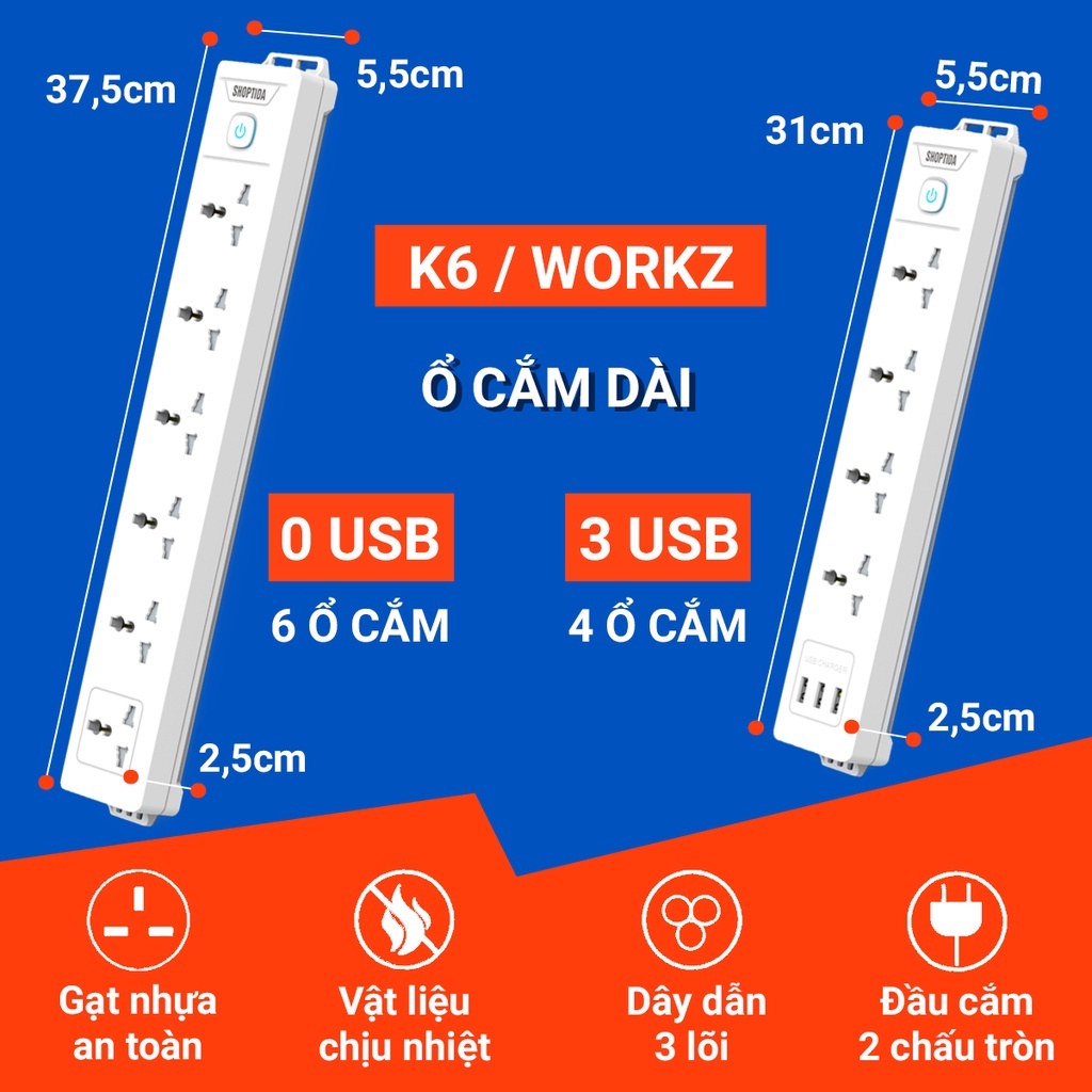 - Ổ điện dài: K6 không có ổ USB kích thước 42x5x2 (cm)
