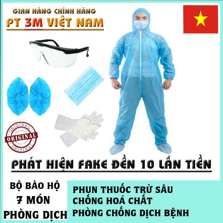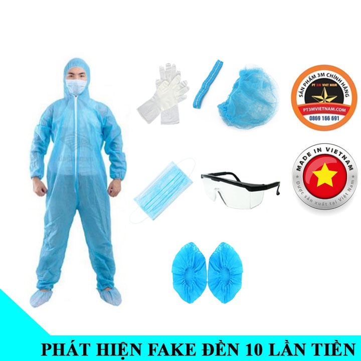- Bộ 7 món đầy đủ bao gồm: áo quần mũ, khẩu trang, bao giày trùm, găng tay cao su và kính bảo hộ