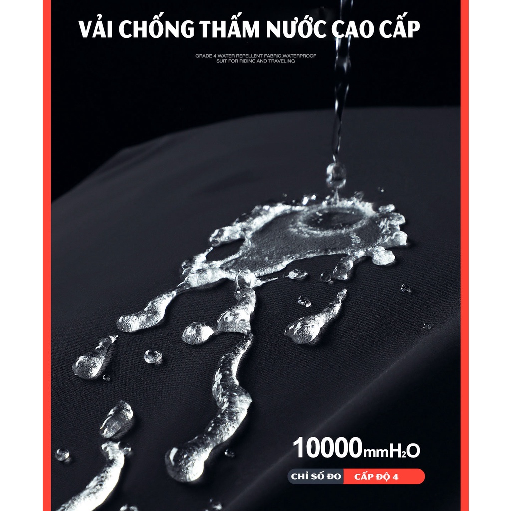- Các đường may, khóa áo chống nước, đảm bảo kín gió, chống thấm nước tối đa