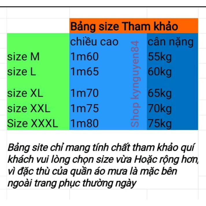 _ Bảng size : Đủ size từ 45 đến 80 kg ,quí khách vui lòng tham khảo ở trên hình thứ 2