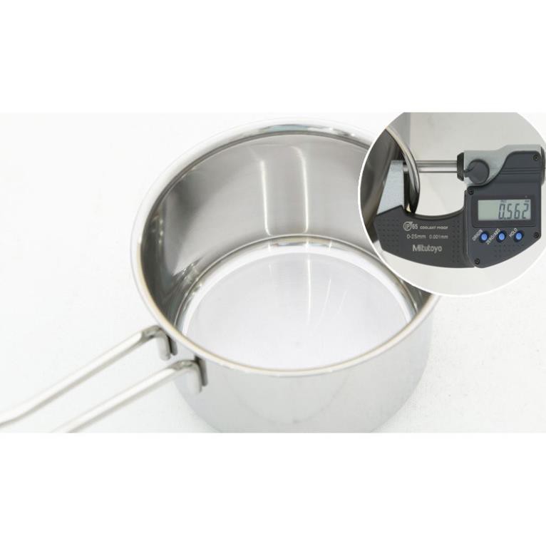 - Nồi được làm bằng inox 430, ít bị oxy hoá, độ dày gần 0.6 mm, giúp làm nóng nhanh, thích hợp nấu cháo, nấu canh lượng ít.