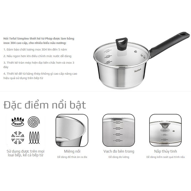 Giới thiệu Quánh Inox 304 đường kính 18cm Tefal Simpleo B9052395 hàng Việt Nam xuất Pháp, bảo hành 5 năm