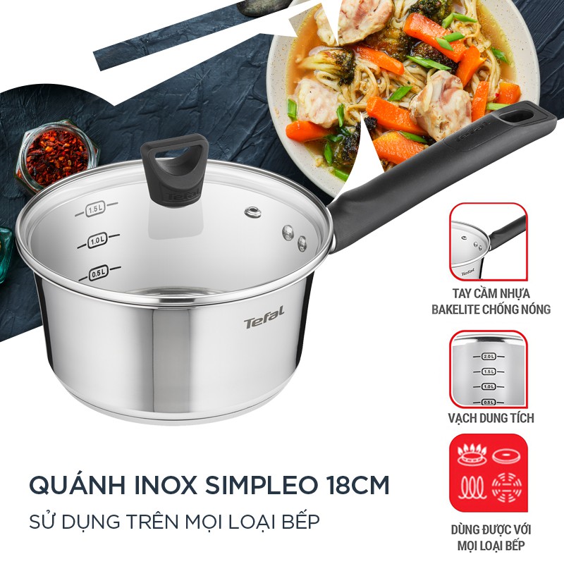 QUÁNH INOX TEFAL SIMPLEO 18cm thiết kế từ Pháp được làm bằng inox 304 cao cấp, hỗ trợ cho việc nấu nướng nhiều kiểu, đảm bảo chất lượng inox 304 lên đến tận 5 năm. Thức ăn được nấu ngon hơn khi điều chỉnh mức nước dễ dàng. Bộ nồi Tefal Simpleo thiết kế tràn mép hiện đại bền chắc hơn và inox. Thiết kế đế từ bằng thép không gỉ cao cấp nâng cao hiệu quả sử dụng trên bếp từ. Nồi có nắp bên trong dễ dàng quan sát thức ăn, an toàn theo tiêu chuẩn của tập đoàn SEB Pháp cho dù không cho dầu mỡ mà trực tiếp nấu đồ ăn cũng không xảy ra phản ứng nào