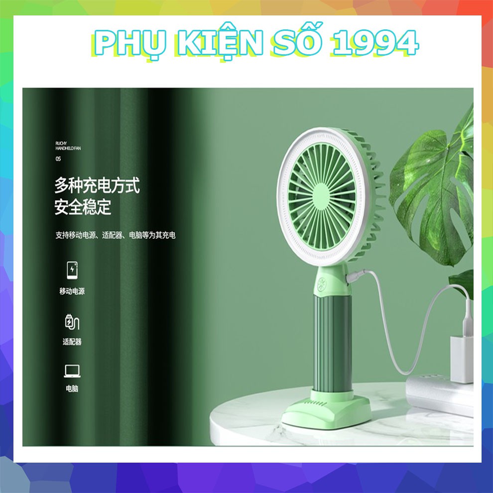 Quạt cầm tay kèm đế dựng điện thoại .Quạt có thêm đèn LED siêu sáng ở viền quạt