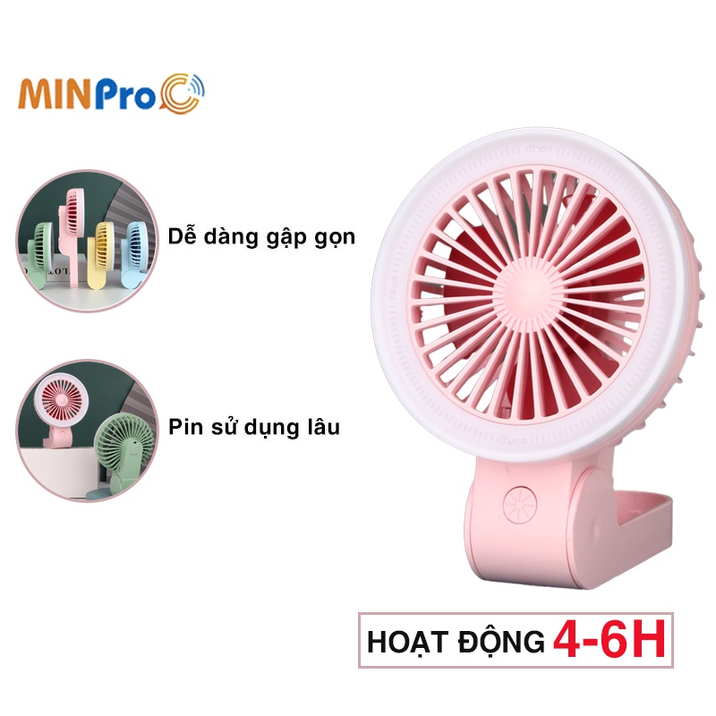 Quạt cầm tay mini MINPRO 3 tốc độ gió có đèn Led, cổng sạc usb, tích điện gấp gọn để bàn