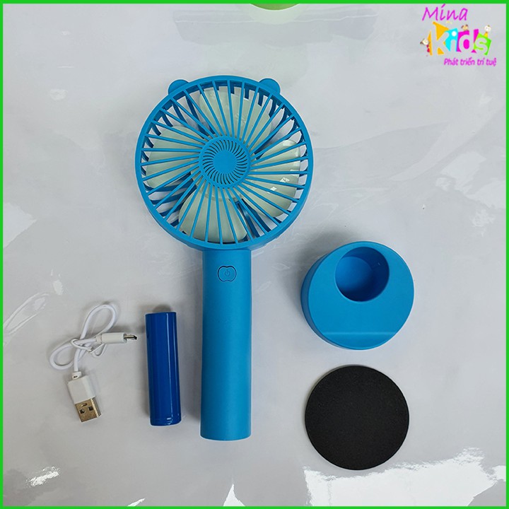 - Quạt mini cầm tay có cổng sạc usb, có chân đế để điện thoại vừa xem vừa quạt mát rất tiện dụng
