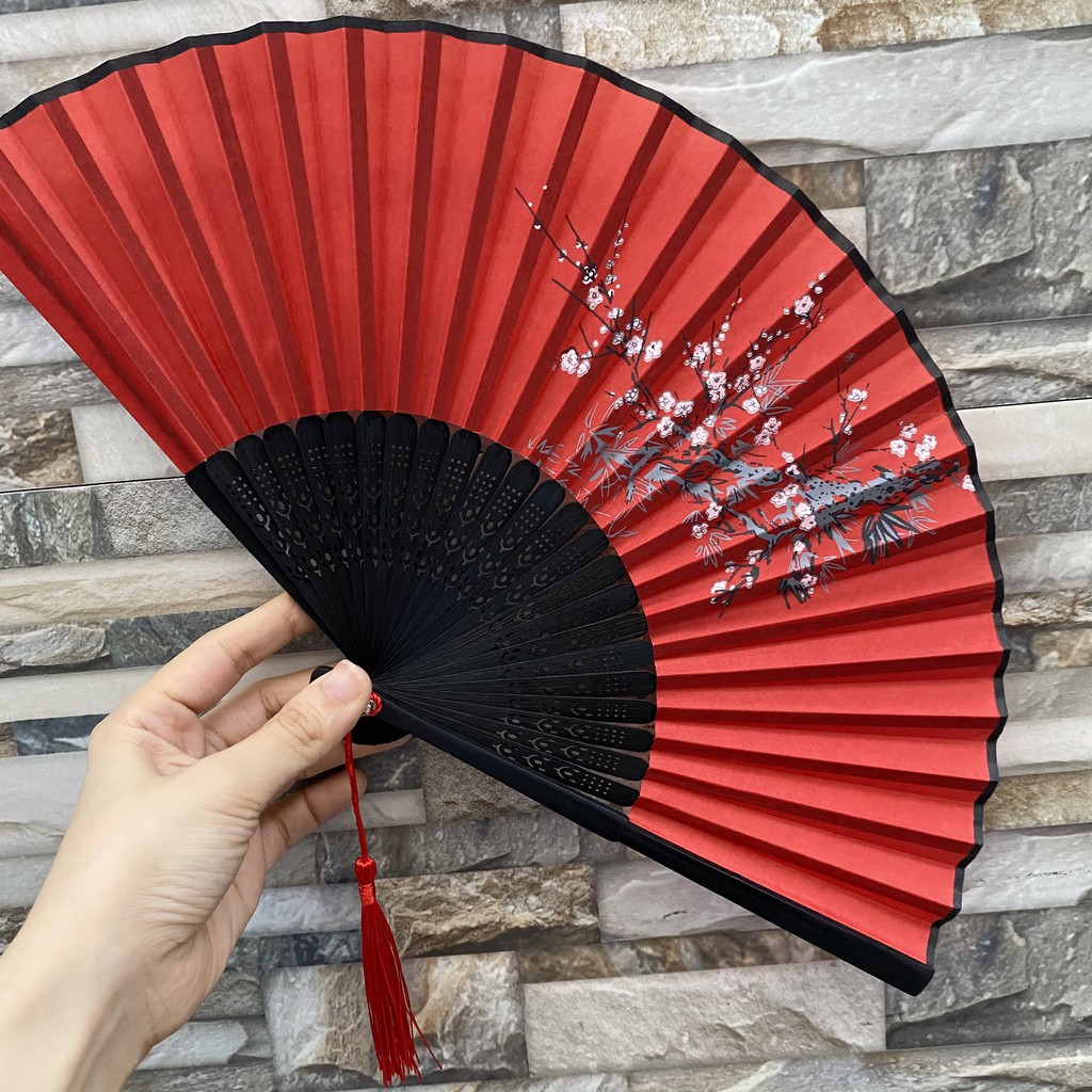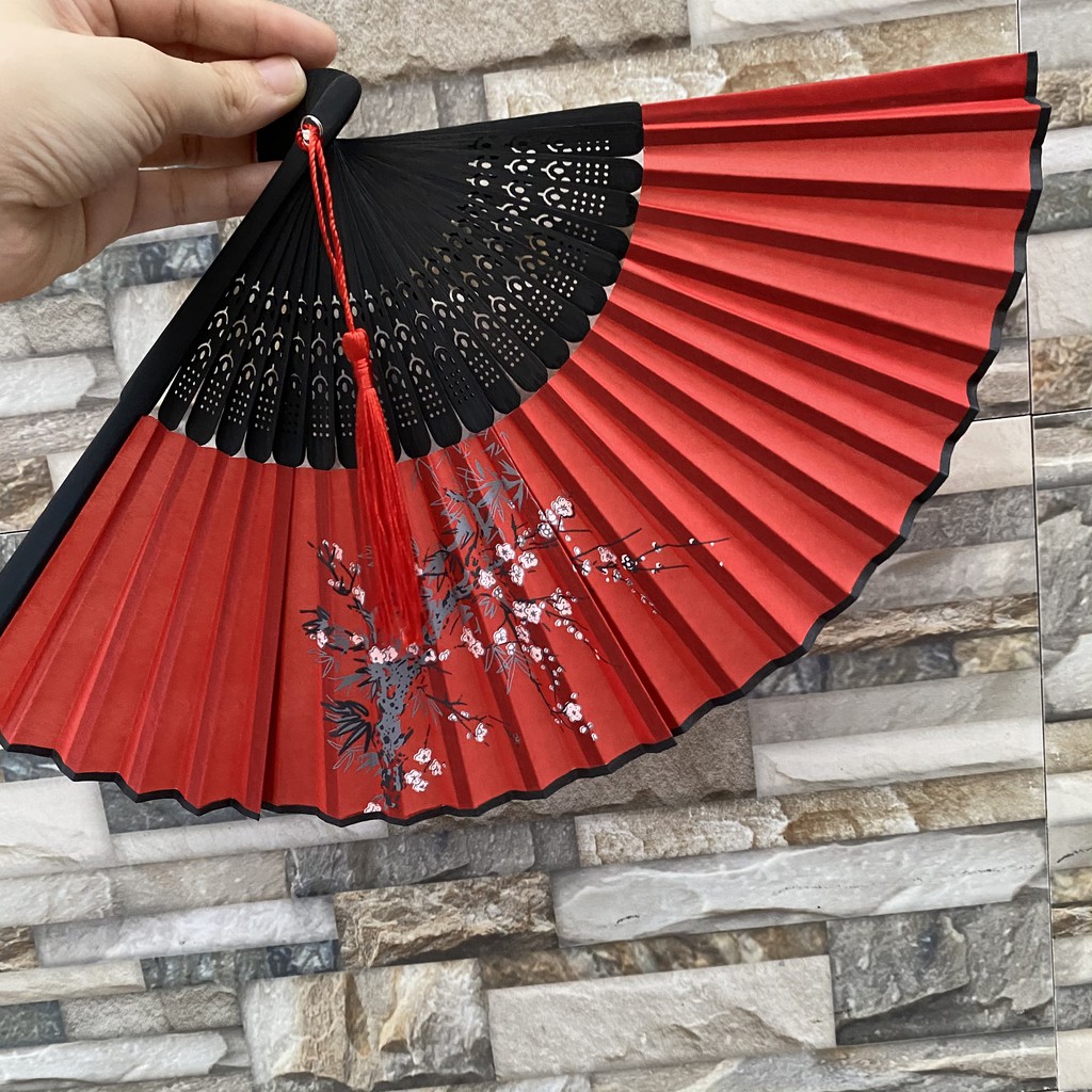 Quạt cổ trang dây tuyến ĐỎ MẬN vải lụa xếp cầm tay cosplay phong cách trung quốcThích hợp làm quà tặng cho bạn bè và người thân