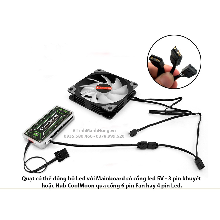 - Cổng kết nối Led: 5V – 3 pin khuyết hoặc cỗng 4 pin Led hay 6 pin Fan gắn Hub CoolMoon.