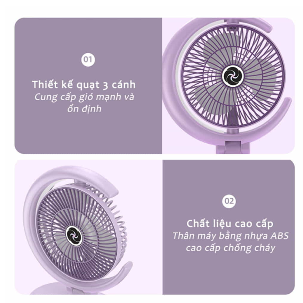 Quạt Để Bàn Tích Điện Mini 3 Cấp Độ Gió Teement, Tích Hợp Đèn Ngủ Động Cơ Không Tiếng Ồn Pin Pin 1200mah , Điều Chỉnh Lên Xuống 360°- Hàng Chính Hãng