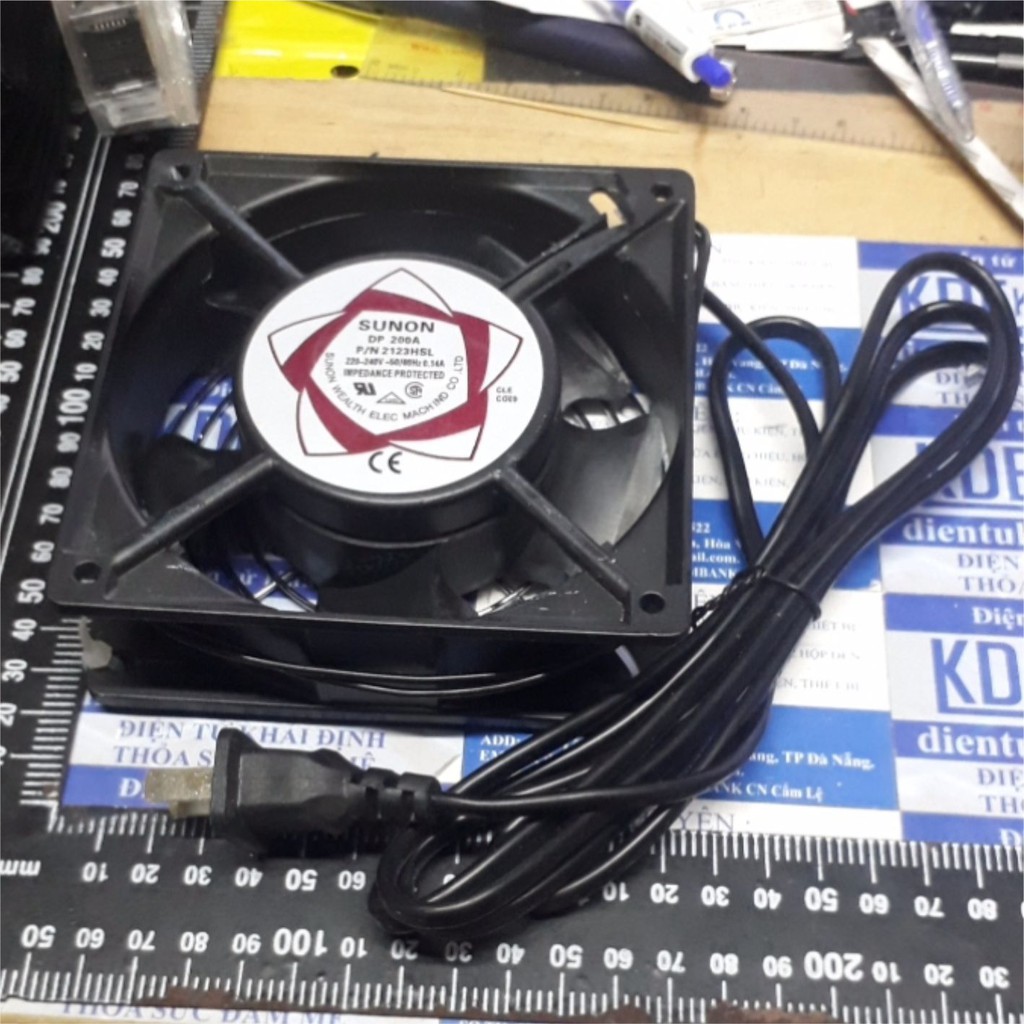 quạt hút 220VAC SUNON 12038 cạnh 12cm, dày 3.8cm + jack cắm + lưới kde2398