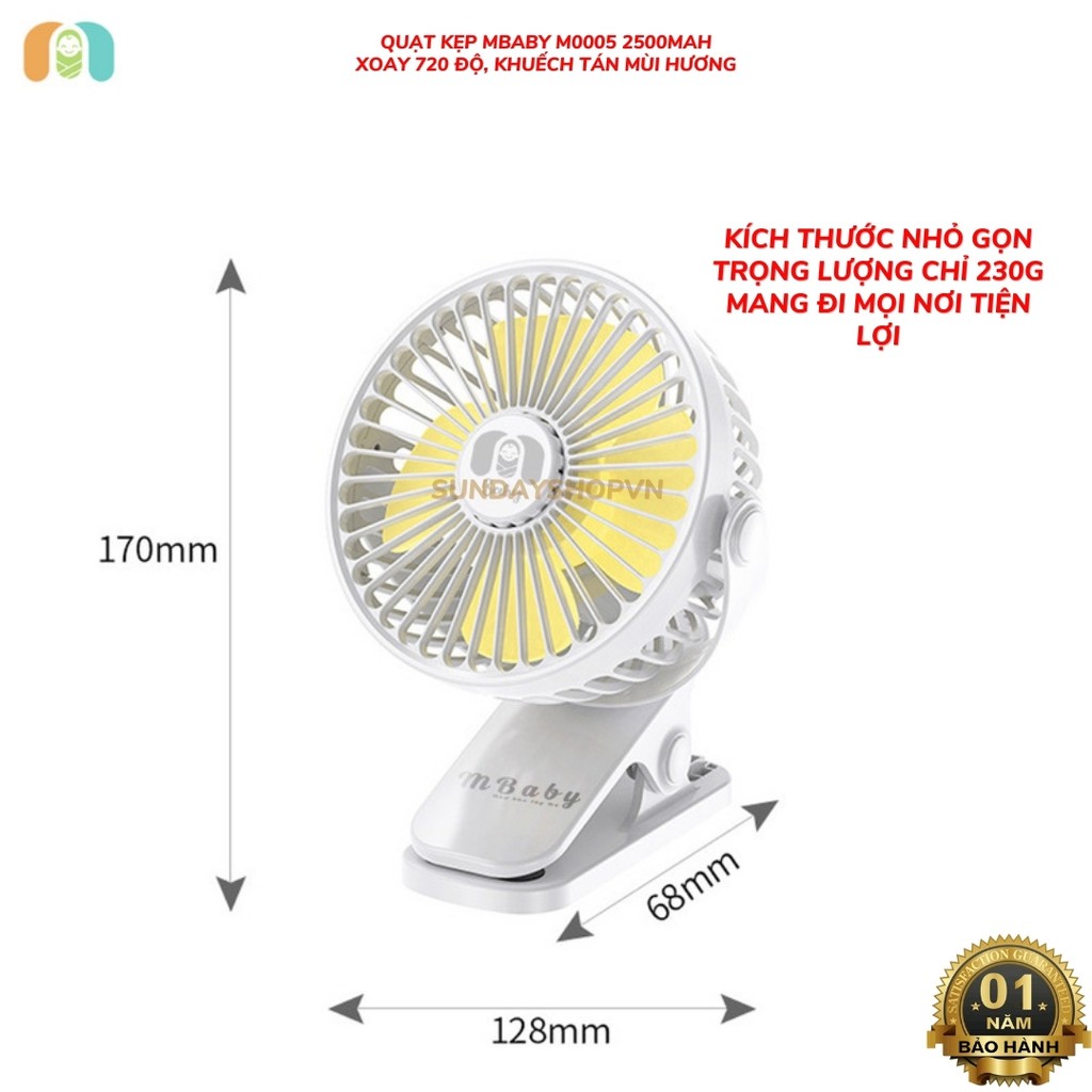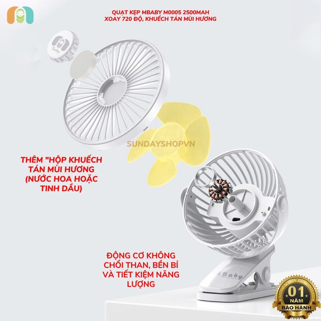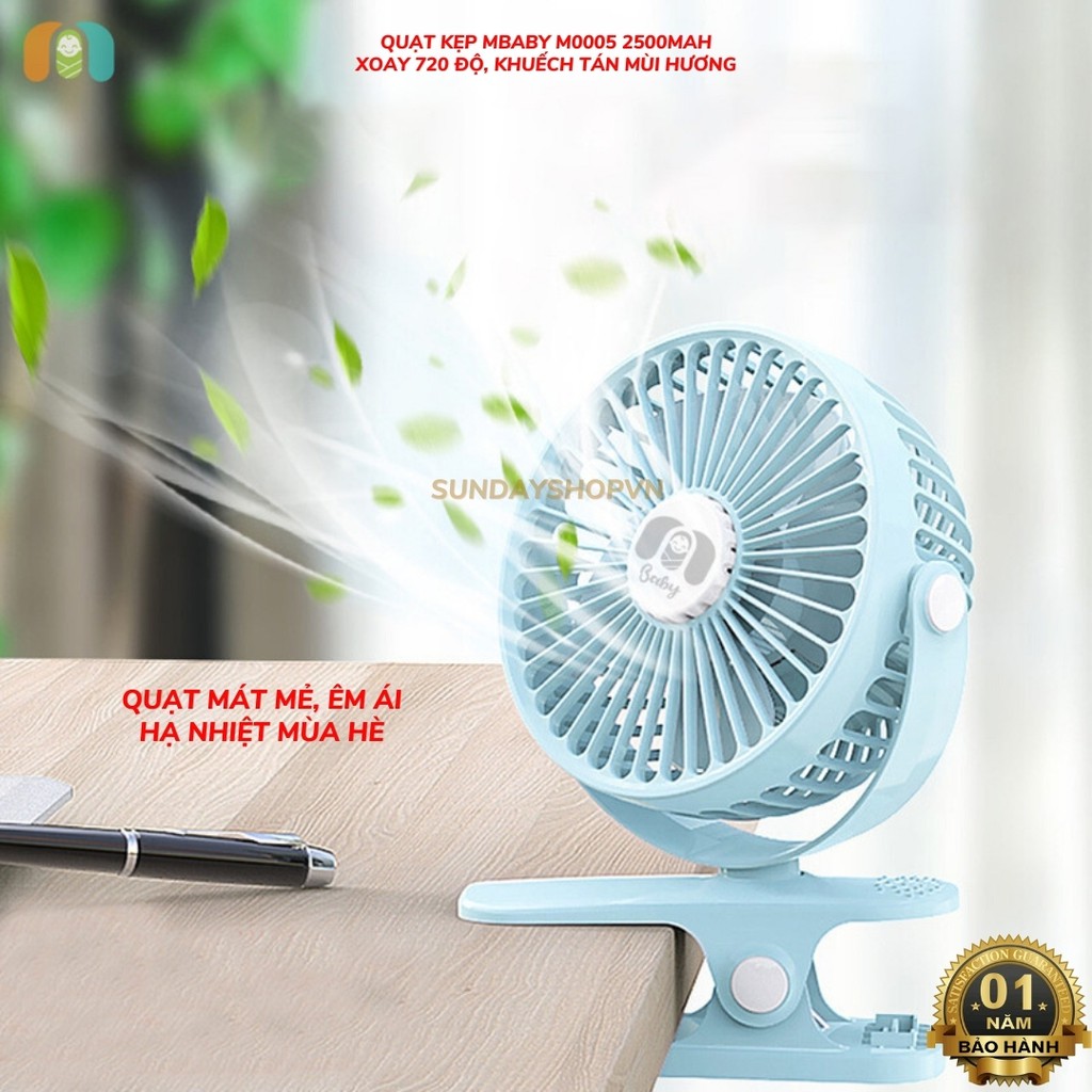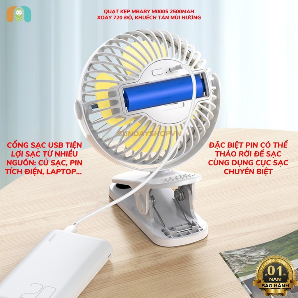 Quạt kẹp MBABY M0005 2500mAh (khuếch tán hương thơm, dùng tối đa 12H, xoay 720 độ, bảo hành 12 tháng)