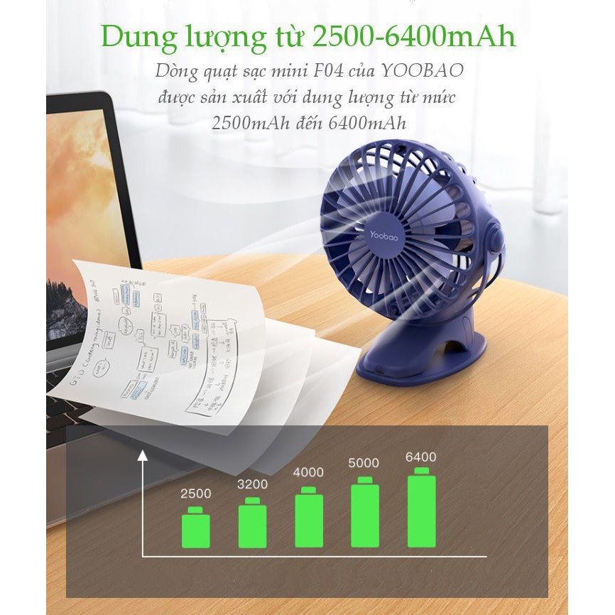 Quạt kẹp YOOBAO F04 xoay góc 360 độ, Quạt kẹp xe đẩy, để bàn pin sạc 6400mAh, chạy liên tục 32 tiếng