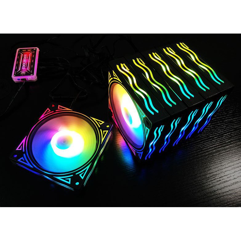 FAN COOLMOON RGB : Tốc độ : 1300-1500 rpm, Trọng lượng : 150g, Lượng gió : 33 CFM, Độ ồn : 23.5 dBA, Tiêu thụ : 3.8wDây LED RGB COOLMOON : Đế hút nam châm, Tiêu thụ : 3,5w, dài 40cm