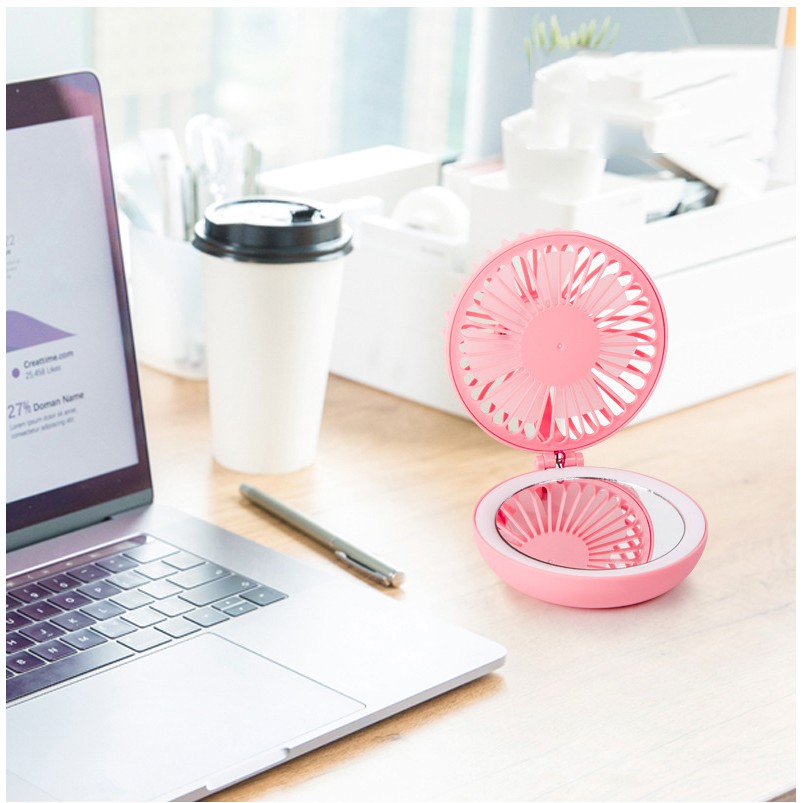 Quạt Mini Có Gương Soi Tiện Lợi Siêu Xinh👉 Có đèn giúp Hỗ Trợ Chụp ảnh