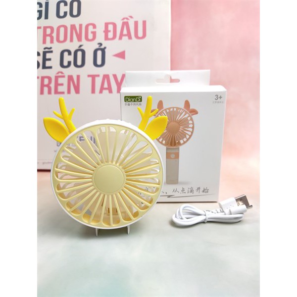 Quạt Mini Cầm Tay Cao Cấp Có Thể Gấp Tiện Dụng, Fan 2 Tốc Độ Gió Kèm Usb Cắm Sạc Hình Sừng Tuần Lộc - Màu Vàng
