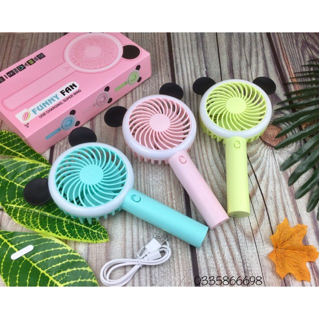 - Quạt mini USB cầm tay với thiết kế xinh xắn, nhỏ gọn cực kỳ tiện dụng để bạn mang theo bên mình mọi lúc mọi nơi. Cánh quạt chạy êm và rất mát, sản phẩm chắc chắn sẽ làm bạn hài lòng trong những ngày hè nóng bức khó chịu này.Quạt với có thể sử dụng qua cốc sạc điện thoại hoặc ipad, tiện lợi hơn bạn có thể sử dụng quạt qua cổng USB từ máy tính.Thiết kế đẹp mắt và đa màu sắc phù hợp với từng nhu cầu sở thích hay phông thủy từng cá nhân- Quạt cầm tay mini funny f-666 nhiều màu hình tai gấu trúc dễ thương, sạc usb tích điện, chế độ mát cực mạnh