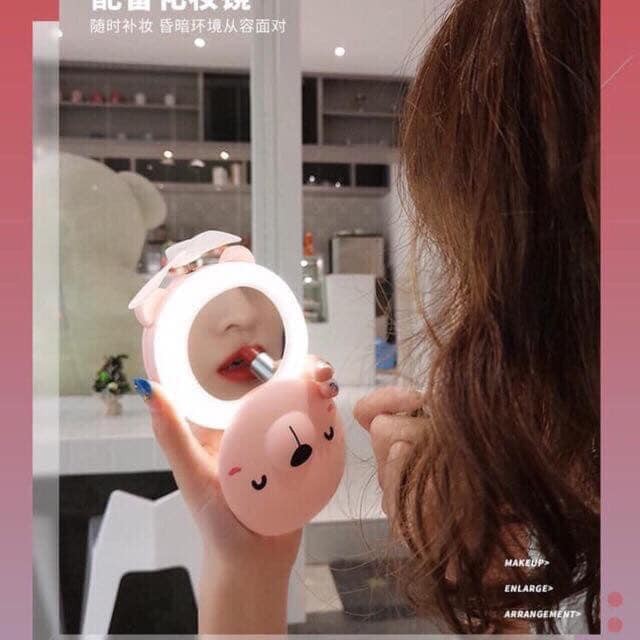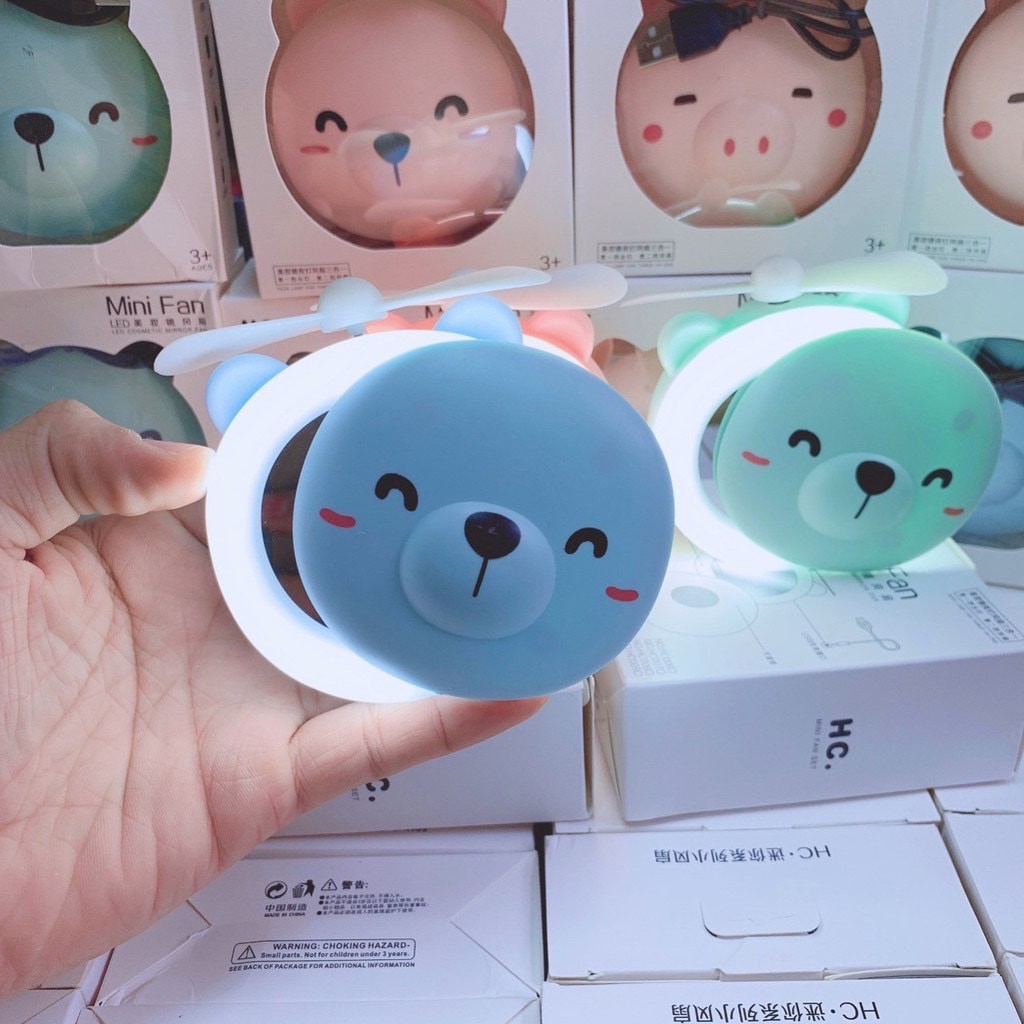 Quạt mini cầm tay lợn hồng, gấu xanh kèm gương và đèn LED siêu dễ thương