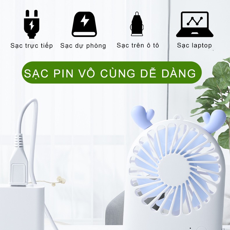 - Sạc pin: Quạt được sạc trực tiếp bằng cổng USB thông qua laptop, sạc dự phòng hoặc Dock sạc điện thoại