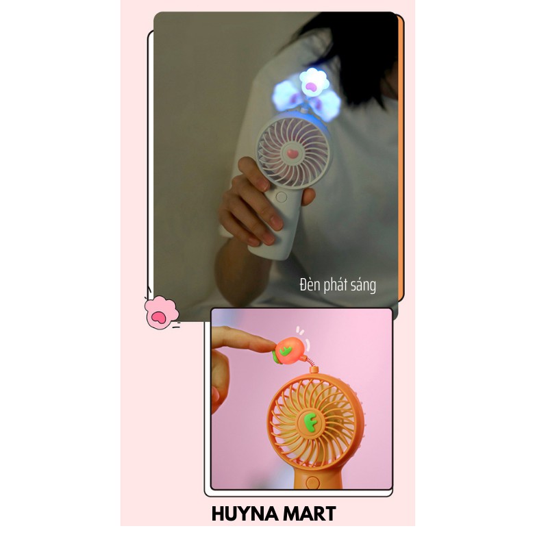 Quạt mini fan cầm tay với thiết kế nhỏ gọn, sáng tạo, có phụ kiện phát sáng trên đỉnh quạt, gió cực mát, tiện mang theo, bạn có thể sử dụng tại nhà hay mang theo mọi nơi bạn đi: khi đi du lịch, đi học, đi làm, khi ở thư viện, lúc đợi tàu xe, khi ở bệnh viện, lúc nhà mất điện, đặc biệt phù hợp với các bạn nữ xinh xắn, sẽ không còn phải lo lắng mồ hôi làm trôi mất lớp phấn trang điểm nữa, khi sở hữu chiếc quạt thần kỳ này ạ.