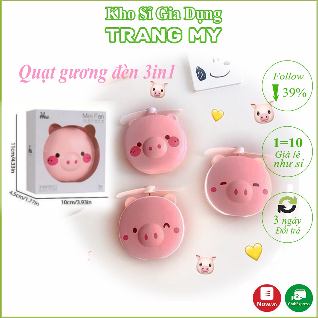 Quạt Mini Cầm Tay Tích Điện - Quạt Gương Đèn Hình Heo 3 In 1 Siêu Đẹp, Tiện Lợi