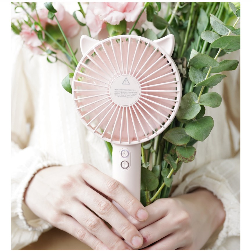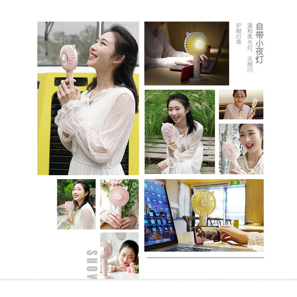 Quạt mini cầm tay tiện dụng 3 tốc độ gió tai mèo cao cấp có đèn kiêm giá đỡ điện thoại