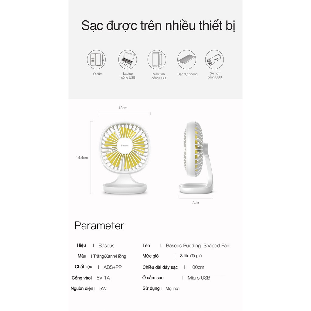 - Quạt mini để bàn Baseus Baseus Pudding-Shaped Fan được làm từ chất liệu nhựa cao cấp ABS + PP , siêu mịn thân thiện với làn da cho bạn cảm giác mềm mại và thoải mái ay.