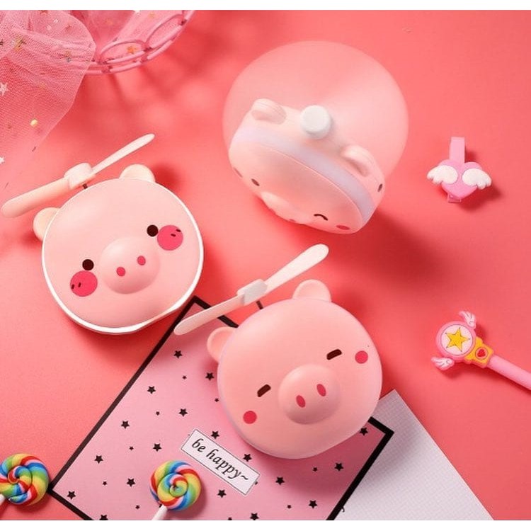 Quạt Mini kèm gương và đèn LED lợn hồng đáng yêu
