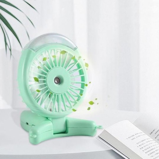- Quạt cầm tay phun sương kèm theo bình chứa nước, sáp thơm. Khi hoạt động, cánh quạt quay sẽ khiến hơi nước lan tỏa một cách dễ chịu.