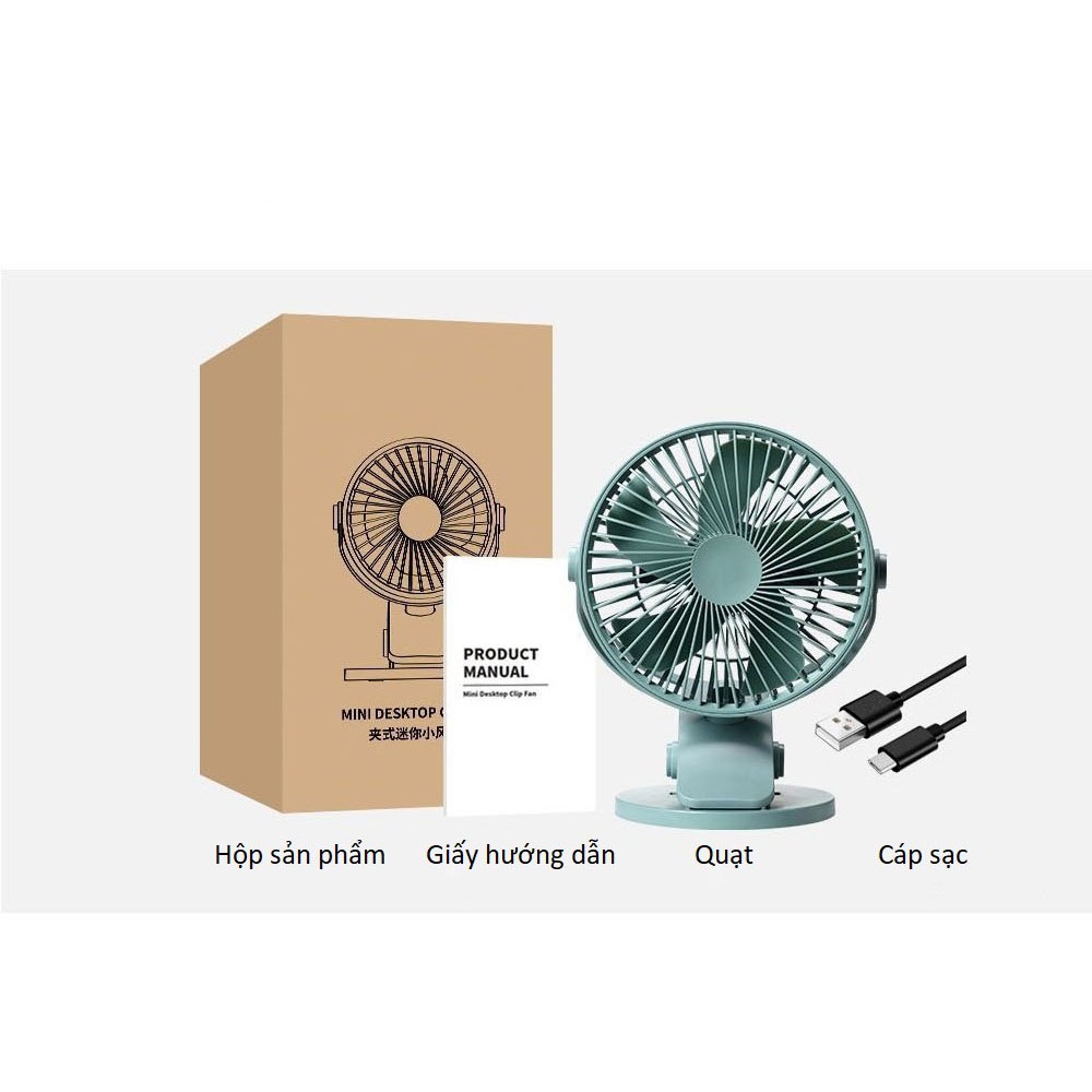 Quạt mini sạc USB kẹp hoặc để bàn, xoay 360 độ, pin 2000mAh nhỏ gọn tiện lợi