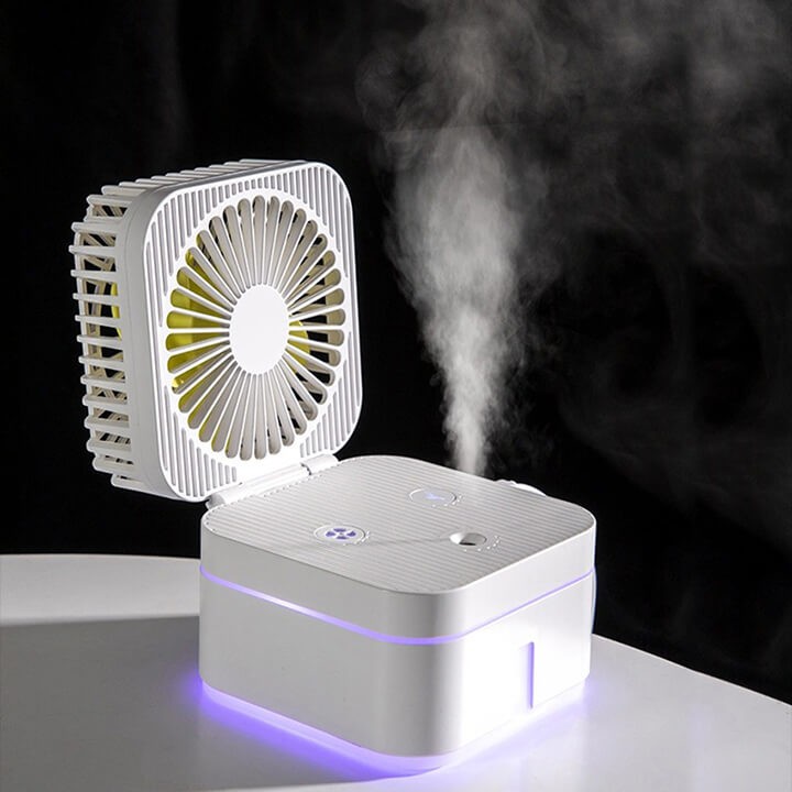 Quạt phun sương mini để bàn sạc điện USB có đèn Led có thể gấp gọn hình khối lập phươngQuạt Phun Sương làm mát với 2 chức năng vô cùng thông minh và nhiều khách hàng hiện nay ưa chuộng bởi nhiều công dụng như: Dùng trong môi trường điều hòa, nếu ở Văn Phòng sẽ giúp chị em phụ nữ da ko bị khô, đảm bảo sức khỏe lâu dài. Nếu ở nhà là giúp cho phòng dùng điều hòa có độ ẩm ổn định, da cũng ko bị khô, trẻ nhỏ ko bị khô mũi...
