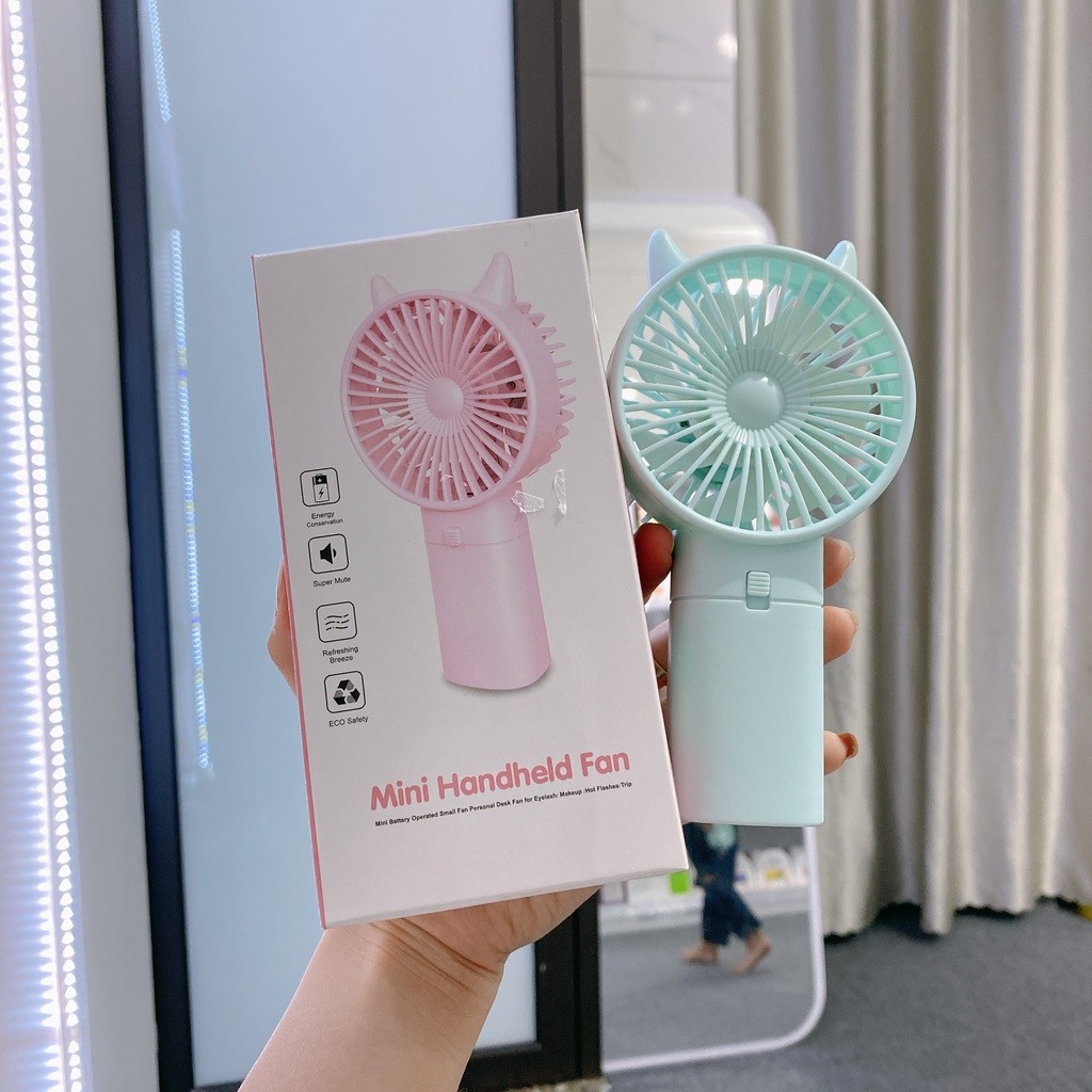 Quạt mini cầm tay chạy pinQuạt cầm tay mini chạy pin xinh cực xinh, tiện cực tiện nha. Đi học, đi làm, đi tàu, đi xe, đi phượt,đi cắm trại, đi du lịch hay đi xếp hàng chờ gọi tên, bốc số khi khám bệnh,.…nắng nôi, nực nội, quạt tay thì mỏi, không quạt thì bức. Sắm ngay 1 em này bỏ túi cứ gọi là khỏe re. Đang nóng, gạt công tắc lên là quạt chạy phà phà. Mặt cứ gọi là tươi không cần tưới luôn í ạ
