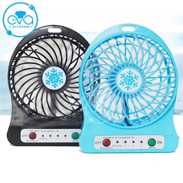 - Phần đế của quạt sạc mini là nơi đặt của các phím điều khiển và các đèn led báo trạng thái làm việc. Phím màu đỏ để tắt thiết bị, phim xanh để bật quạt và tăng tốc độ gió. Cạnh bênh trái là cổng micro USB để sạc và cũng là cổng cấp nguồn trực tiếp cho chiếc quạt khi không có pin ở bên trong. Cạnh phải còn được bố trí một đèn LED nhỏ để làm chức năng đen pin trong trường hợp cần thiết.