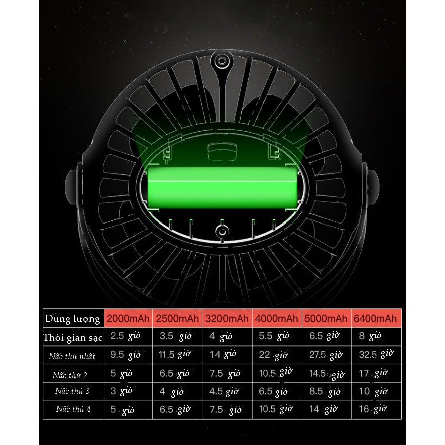 Loại quạt tích điện sạc này nên dùng là loại pin lớn nhất 6400mah , loại pin nhỏ không ăn thua . Có 4 mức độ gió , mức cao nhất có thể sử dụng đc tới khoảng 9 tiếng bật liên tục , còn trung bình sử dụng khoảng 1,5 ngày mới phải sạc tiếp cho 1 lần sạc đầy